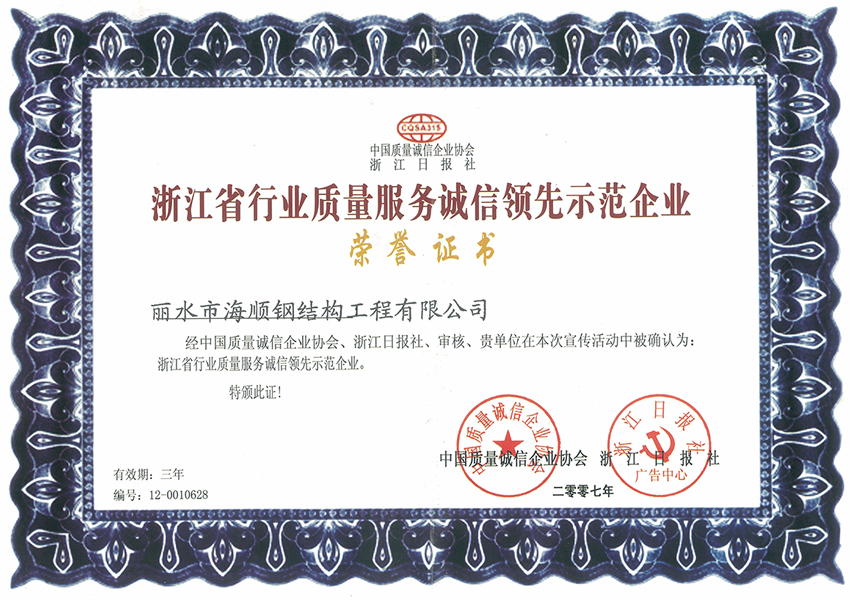 公司本著“質(zhì)以誠信、量以興業(yè)”的經(jīng)營理念,并以精湛的技術(shù)、現(xiàn)代化的設(shè)備、科學的管理、優(yōu)質(zhì)的服務(wù)為廣大用戶提供高品質(zhì)、多用途的產(chǎn)品。隨著企業(yè)不斷的努力,穩(wěn)步的發(fā)展、壯大,公司將繼續(xù)以“誠信”為宗旨,繼往開來。海順建設(shè)公司愿意與本行業(yè)同仁一起努力,開創(chuàng)中國鋼結(jié)構(gòu)產(chǎn)業(yè)的世界品牌。